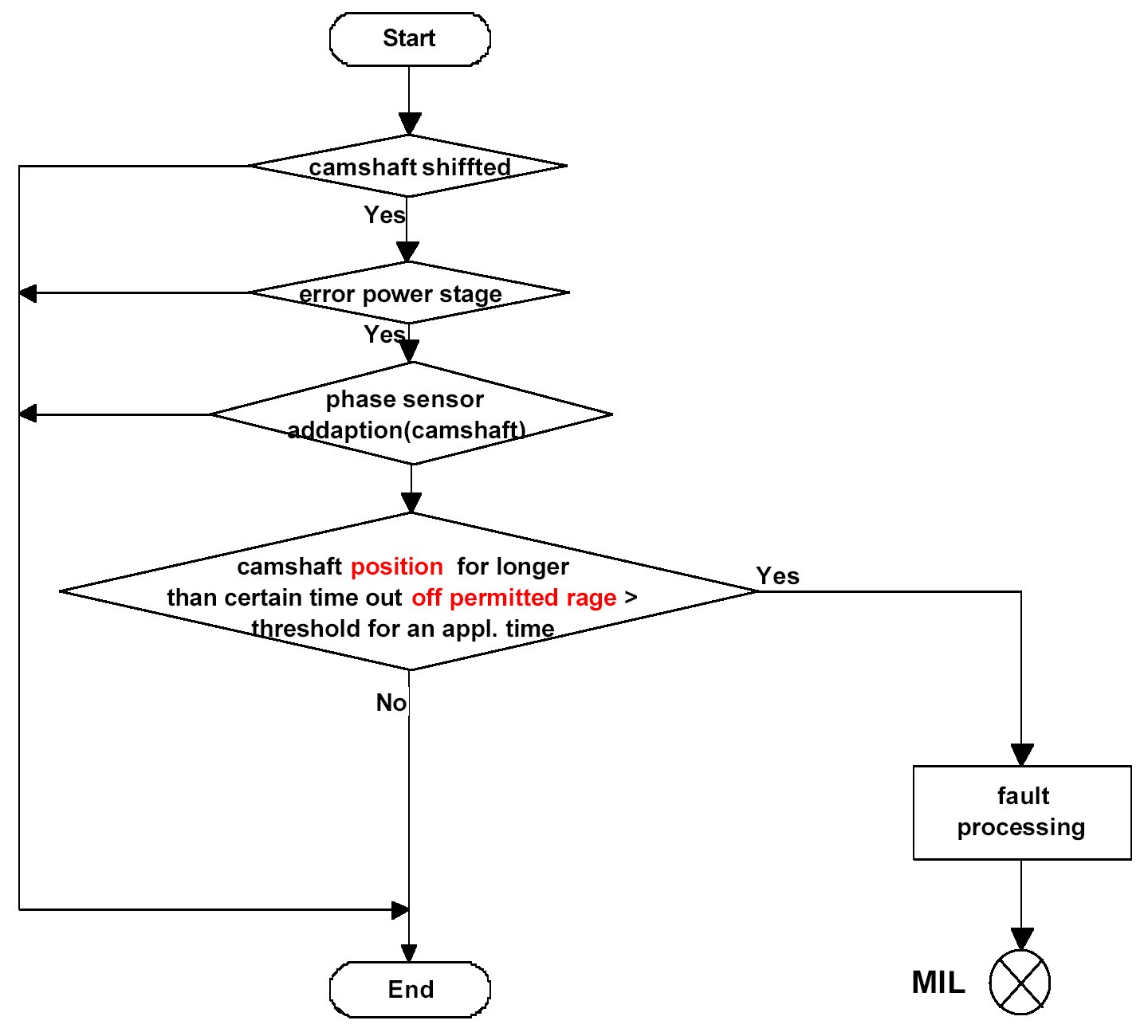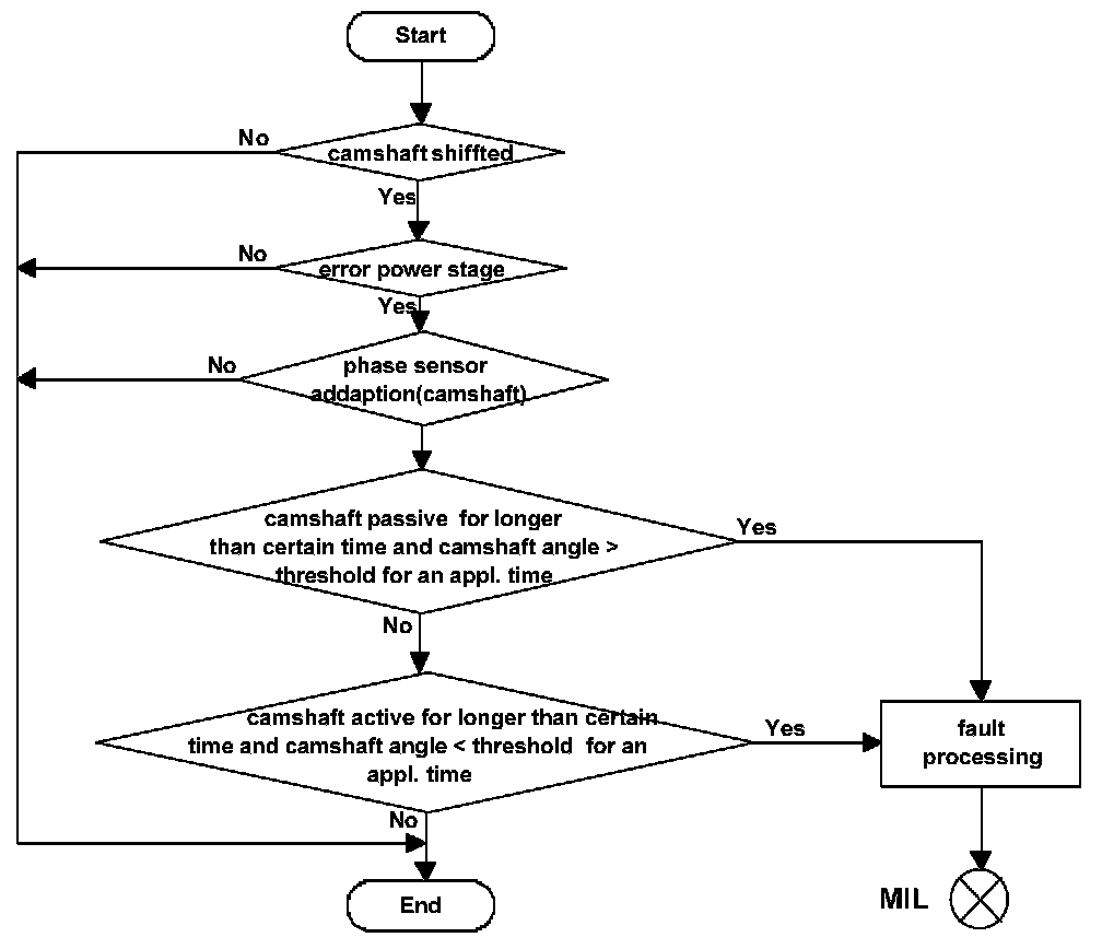 If the actual camshaft angle differs for a certain time to the desired camshaft position for a in a characteristic map specified range, a camshaft positioning (plausibility) fault will be stored.