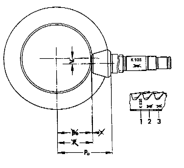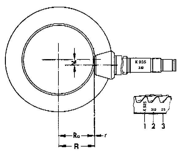 The deviation "r" referred to the master gauge "Ro" is measured for the drive sets supplied as spare parts and is recorded on the outer circumference of the crown wheel. Every drive set (output shaft and crown wheel) must be replaced only together.