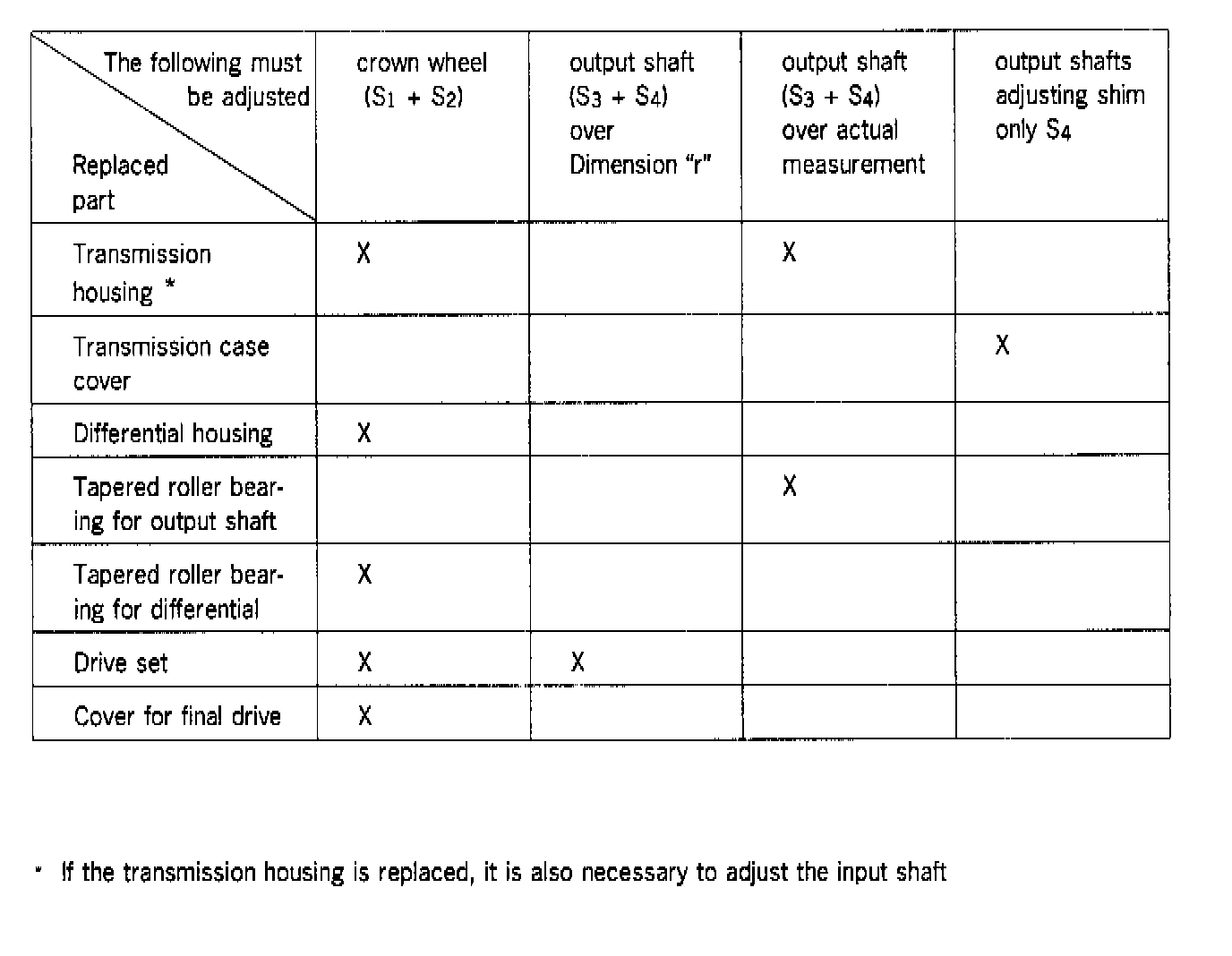 When carrying out assembly work on the final drive, readjustment of the output shaft and crown wheel or drive set is necessary only if parts are being replaced which directly influence the adjustment of the final drive. In order to avoid unnecessary adjustment work, pay attention to the table: