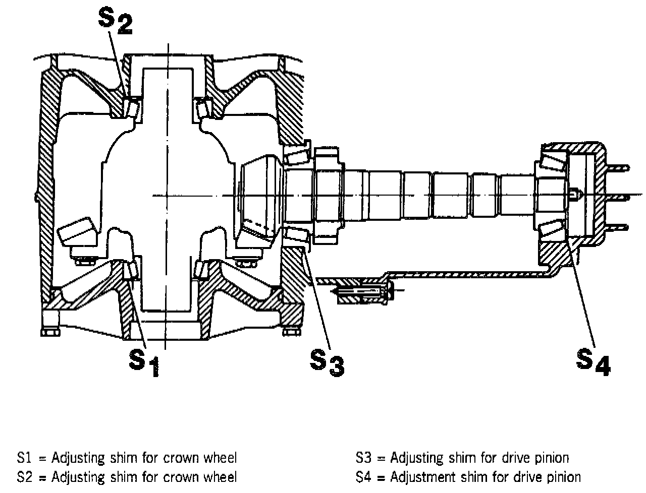 12. Install determined adjusting shims "S1" on the crown wheel side and "S2" opposite the crown wheel.