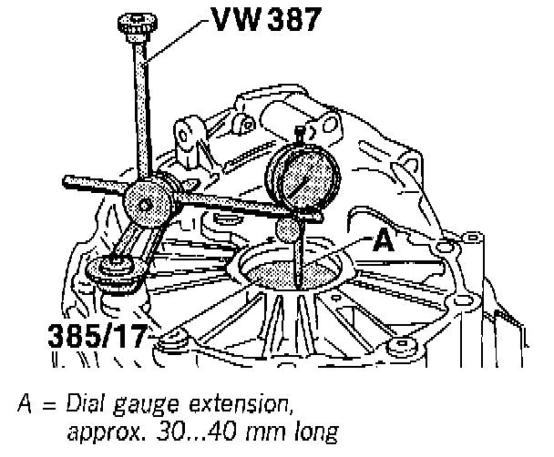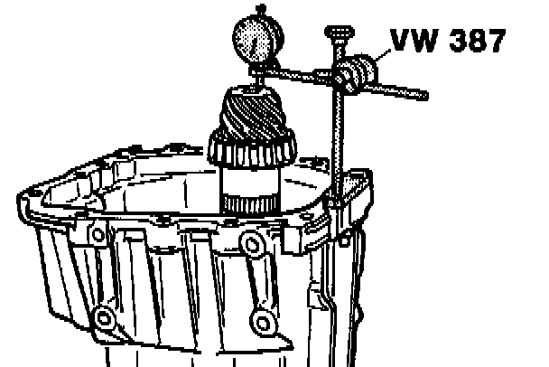 6. Secure the special tool VW 387 with the dial gauge and extension to the housing, and set to "0" with 1 mm preload.