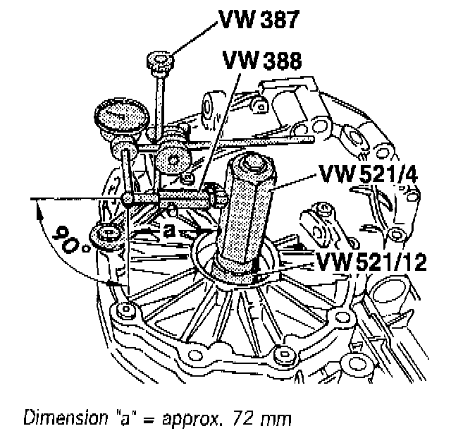 3. Screw the special tool VW 388 to the special tool VW 521/4 and adjust the lever length to 72 mm with the gauge plunger.