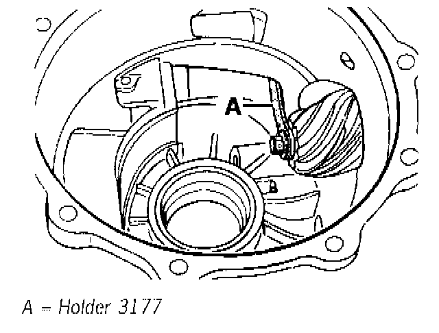 Note If the friction coefficient of the output shaft is too low, the special tool 3177 must be fitted so that an exact circumferential backlash can be measured. The differential can then only be inserted in such a way that the aperture of the bevel gears faces the output shaft.