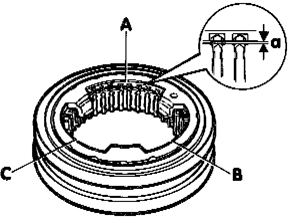 1. Check the synchronizing rings for wear. To do this, press the ring into the shift sleeve and measure the gap dimension "a" with a feeler gauge in positions A, B and C. Add up the measured values and divide by 1 The value obtained must not be below 0.5 mm.