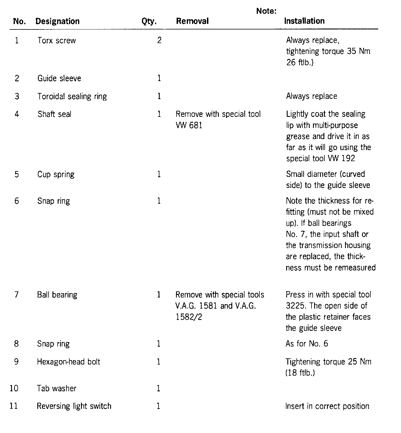 1. Clamp the transmission in the assembly support using the special tool 9589 or VW 540 and drain off the gear oil.