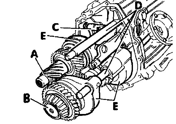 4. Take out the input shaft "A", the output shaft "B", the relay shaft "C", the shift rods "D" and the shift forks "E" together.