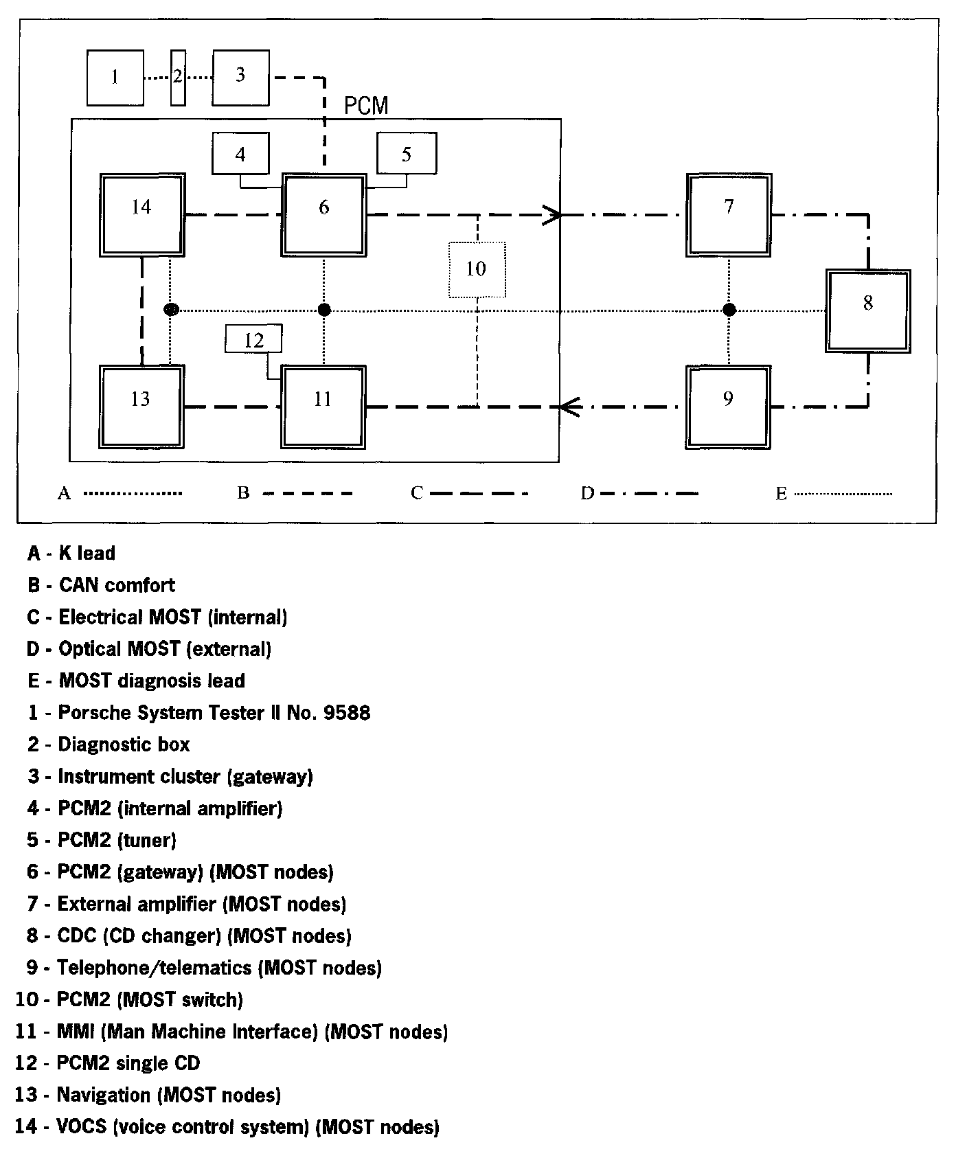 Communication between the Porsche System Tester II No. 9588 and the MOST control modules only takes place via the K lead to the instrument cluster. The data is transferred from the instrument cluster gateway to the MOST control modules, via CAN Comfort to the PCM2 gateway, via the electrical MOST in the PCM2 and via the optical MOST outside of the PCM2.