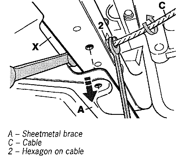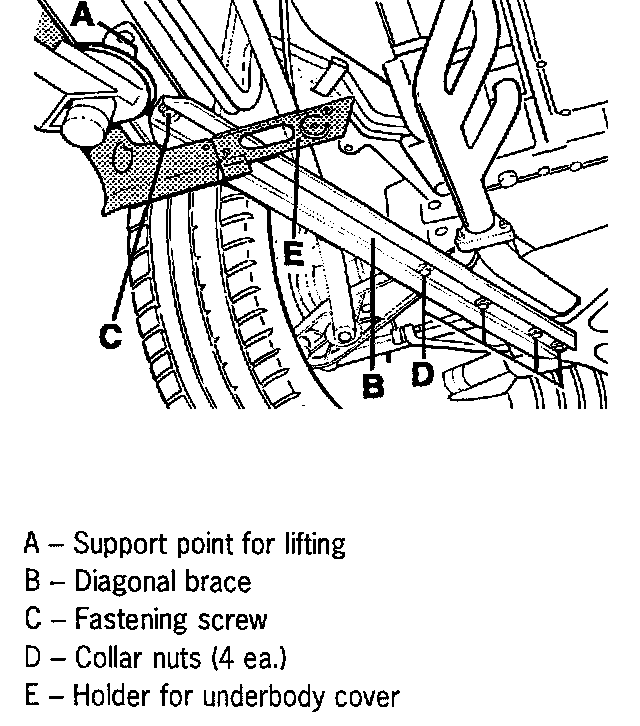 1. Lift the vehicle. When lifting, ensure that the fastening screws (C) of the right and left diagonal braces (B) are still accessible.