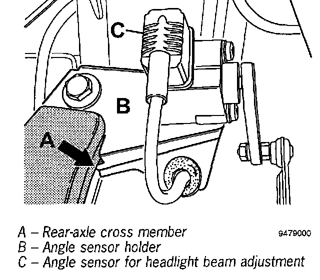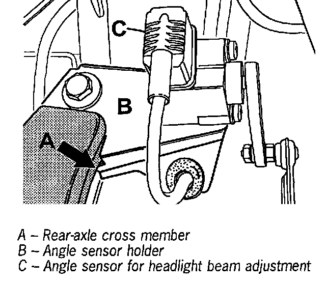 9. On vehicles with automatic headlight beam adjustment, remove the angle (C) sensor located on the left side of the vehicle.