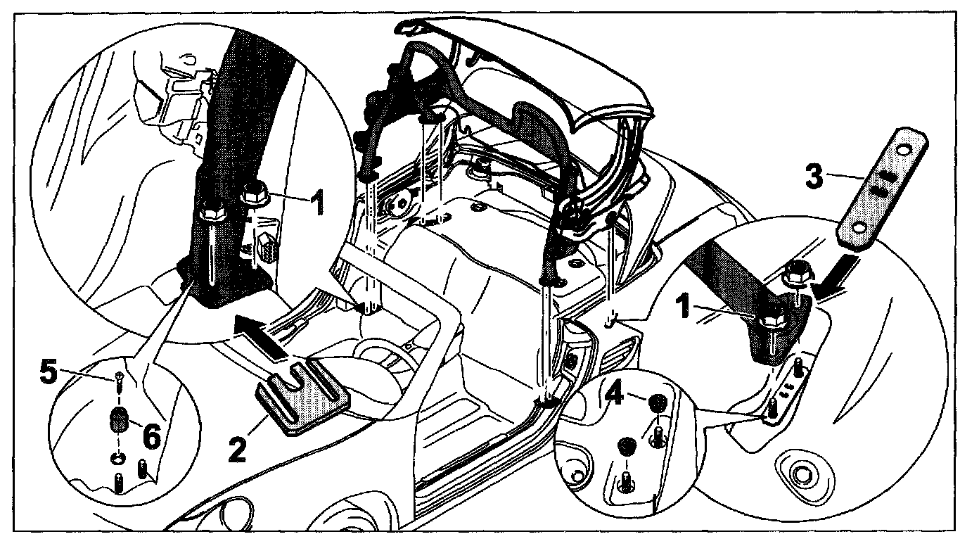The roll-over bar is measured in production in the vehicle and fixed with dowel pins -6- and dowel sleeves -4- on the left and right sides.