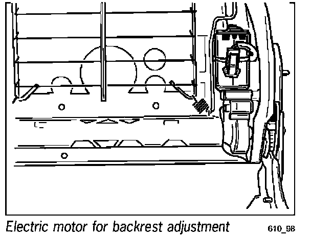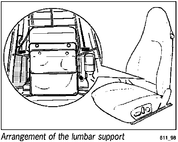 The lumbar support consists of two cushions which are inflated by means of a motor for lumbar support. The cushions are inflated or deflated to the required pressure one after the other beginning with the upper cushion. The pressure in the cushions is measured using a pressure sensor (regulating switch). The pressure sensor is located at the same height as the headrest and is integrated into the lumbar adjustment. Automatic adjustment of the lumbar support is carried out by actuating the switch for memory seat adjustment. The motor for lumbar adjustment is shown in Figure 611_98 together with both lumbar cushions. Automatic adjustment of the lumbar support is divided into two phases.