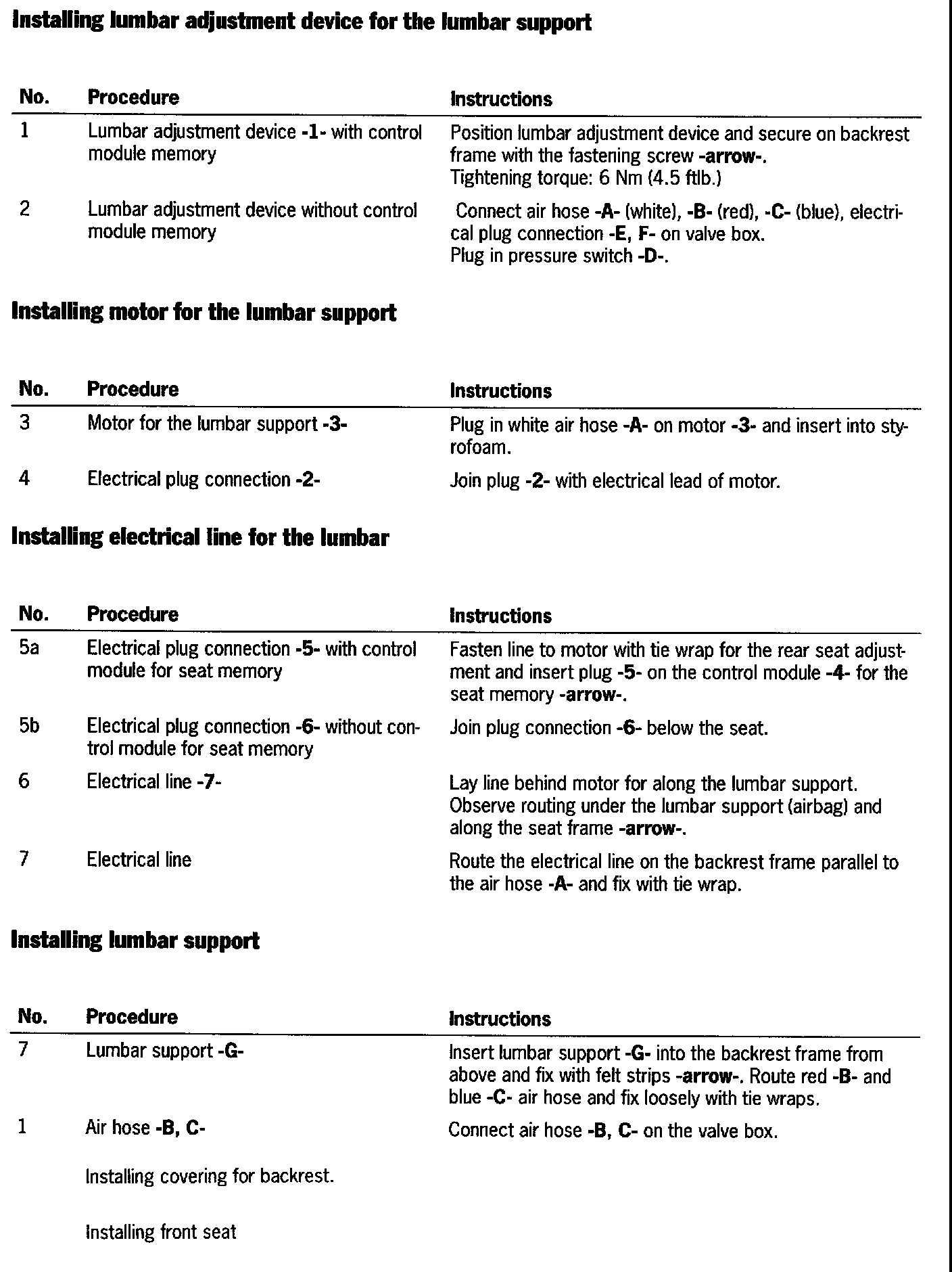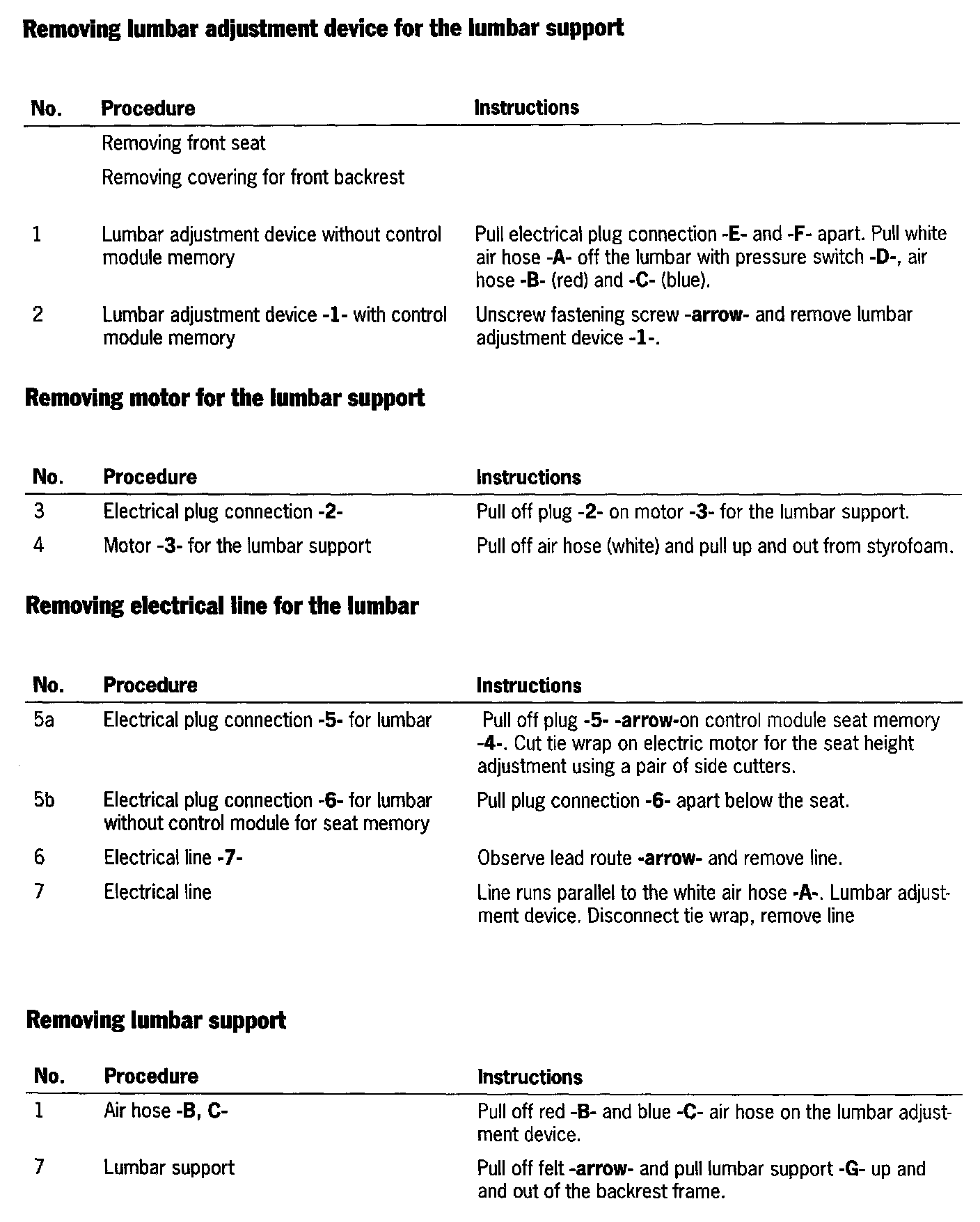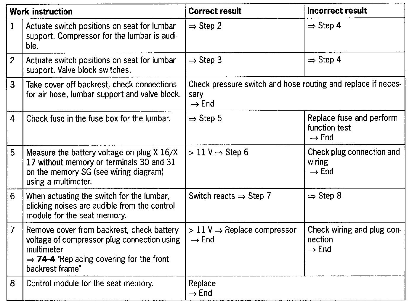 In the case of the complaint "lumbar support does not function" proceed according to the following work instruction. As the seat functions vary, the test plan principally complies with the seat version with seat memory adjustment. Work aids: Use wiring diagram and multimeter.