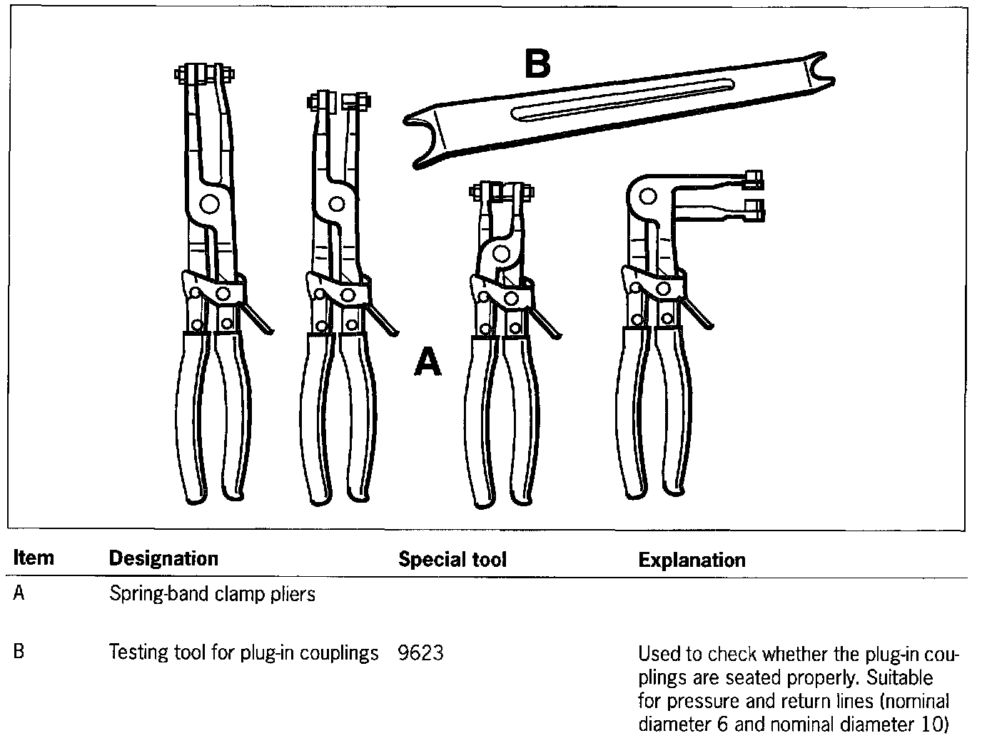 30. The correct engagement of the plug-in couplings should be checked using the special tool 9623. To check this, insert the special tool 9623 between the plug-in coupling and the screwed plug and tilt the tool slightly. The plug must not slide out.