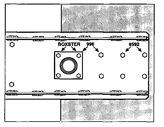 4. Fasten the special tool adapter 9163/2 with a hexagon-head bolt M8 x 25 (bolt quality 10.9) and hexagon-head bolts M8 x 16 (bolt quality 10.9) at the designated positions "Boxster". The adapter and the support plate are fastened on the retainer plate with the M8 x 25 hexagon-head bolts. The M8 x 16 hexagon head bolts connect the adapter with the support plate.