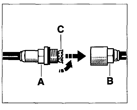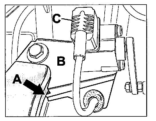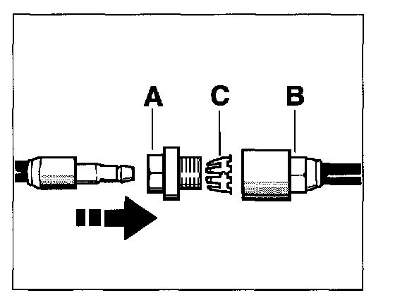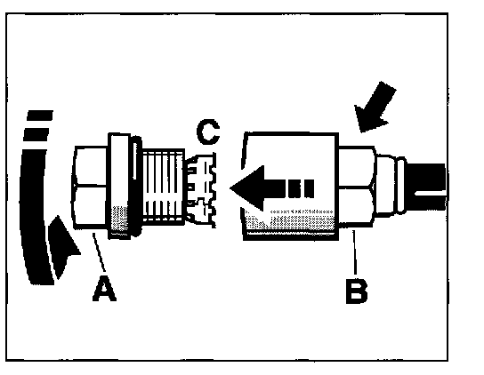 28. Insert the holder -C- into the threaded part -A- and screw both into the plug-in coupling -B- and tighten. Make sure to counter with a wrench when tightening. The tightening torque for the steering pressure line is 30 Nm (22 ftlb.) (wrench size 15). The tightening torque for the steering return line is 40 Nm (30 ftlb.) (wrench size 19).