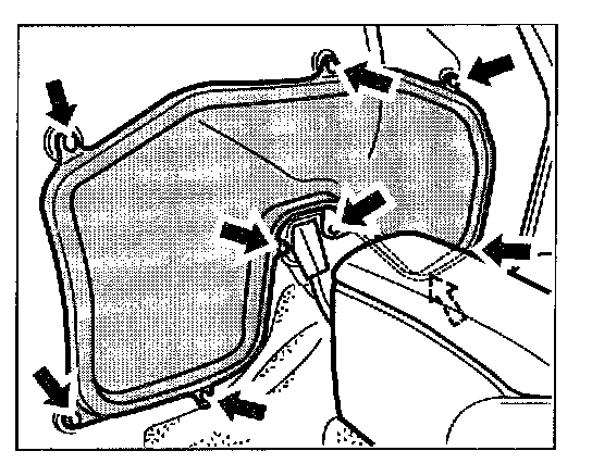 56. Engage the cloth covering of the convertible top on the left and right into the retaining lugs.