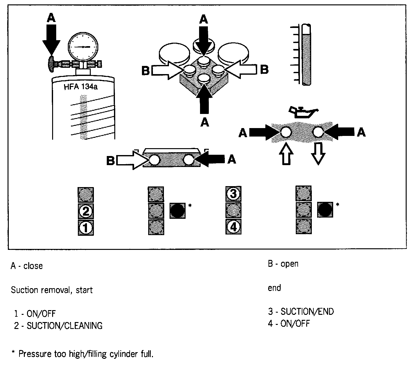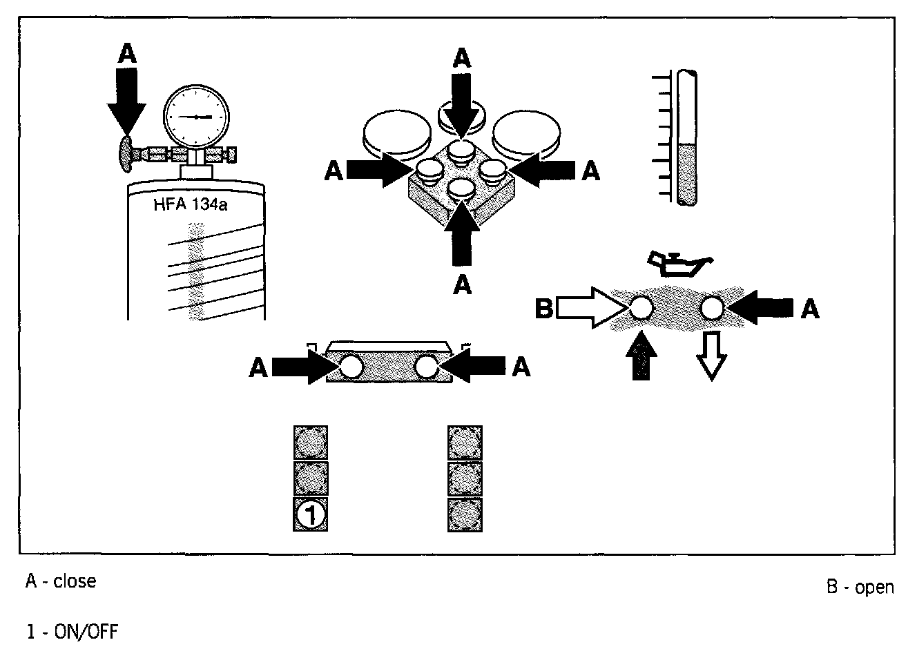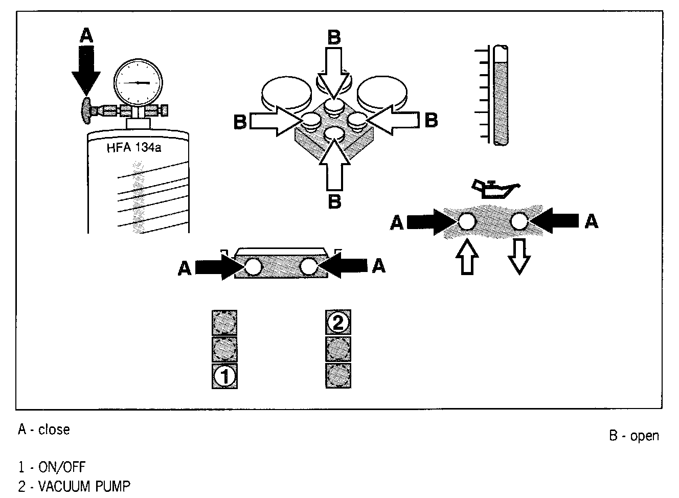 After the refrigerant has been removed by suction and a component has been replaced, the oil quantity must be determined and topped up by the quantity remaining in the removed component.