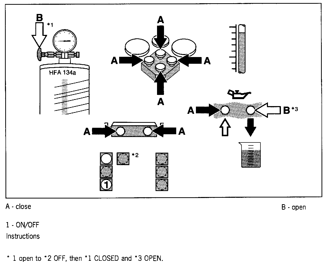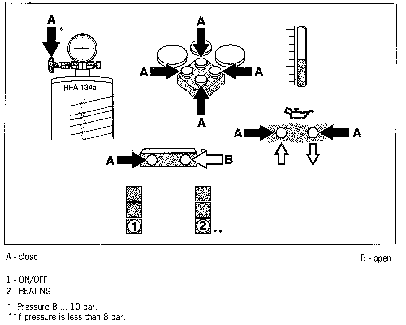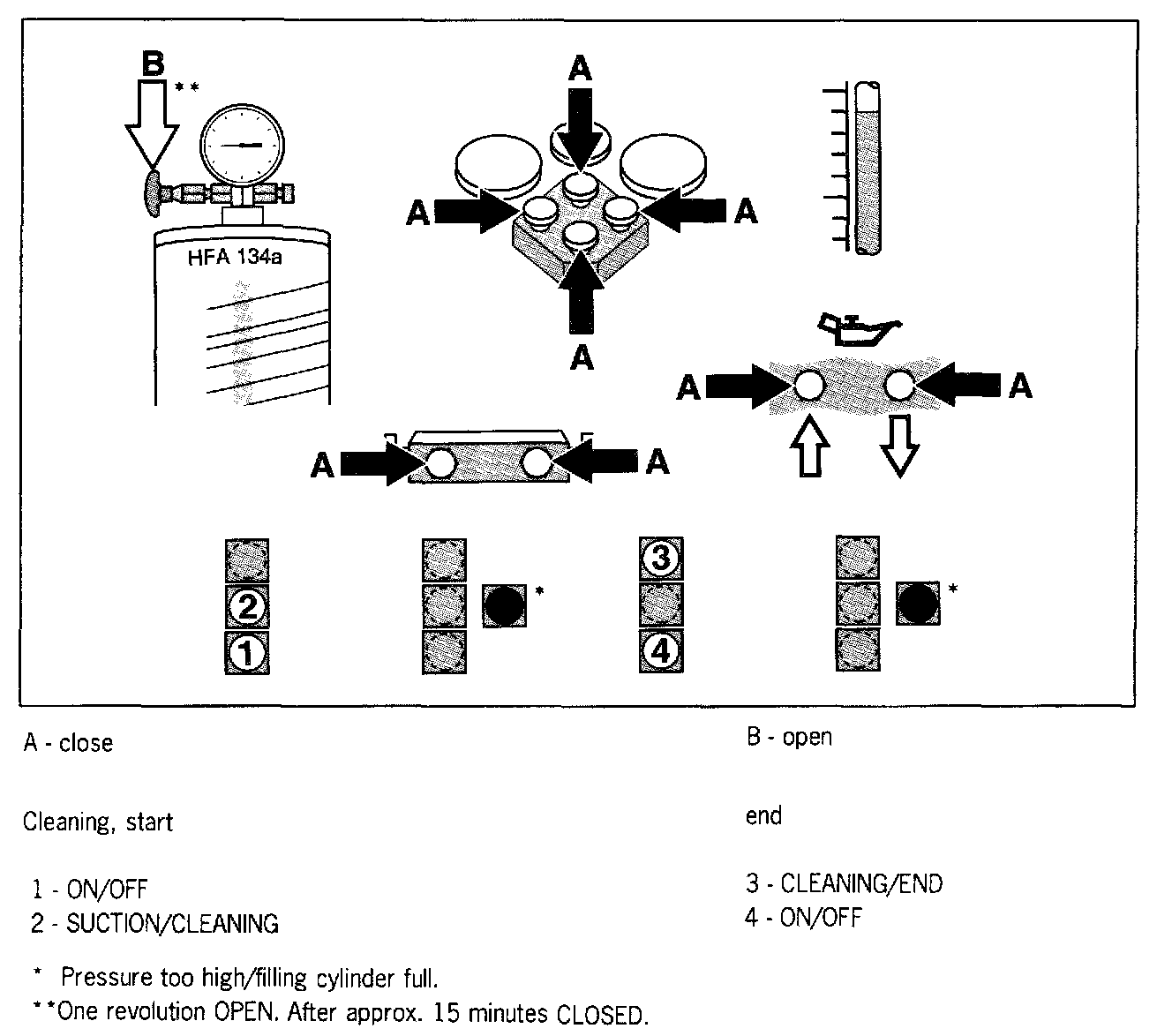 After the refrigerant has been removed by suction and a component has been replaced, the oil quantity must be determined and topped up by the quantity remaining in the removed component.