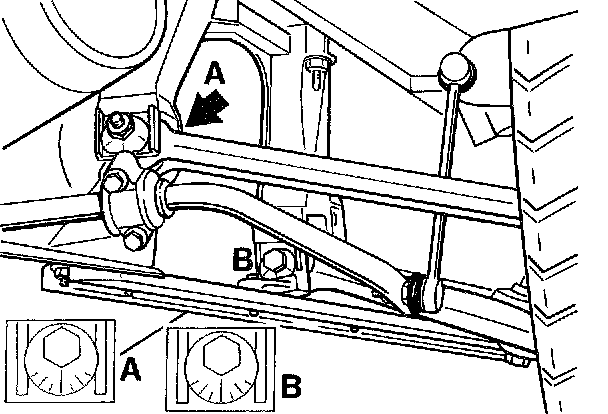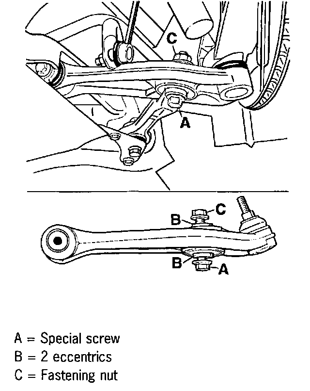 On vehicles with a caster adjustment facility, adjust the caster by turning the special screw (A) with the fastening nut (C) loosened.