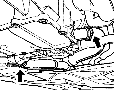 16. Pull the radiator supply and return lines off the engine. To do so, undo the screw-type hose clamps, carefully pull off the hoses and allow the remaining water to run out.