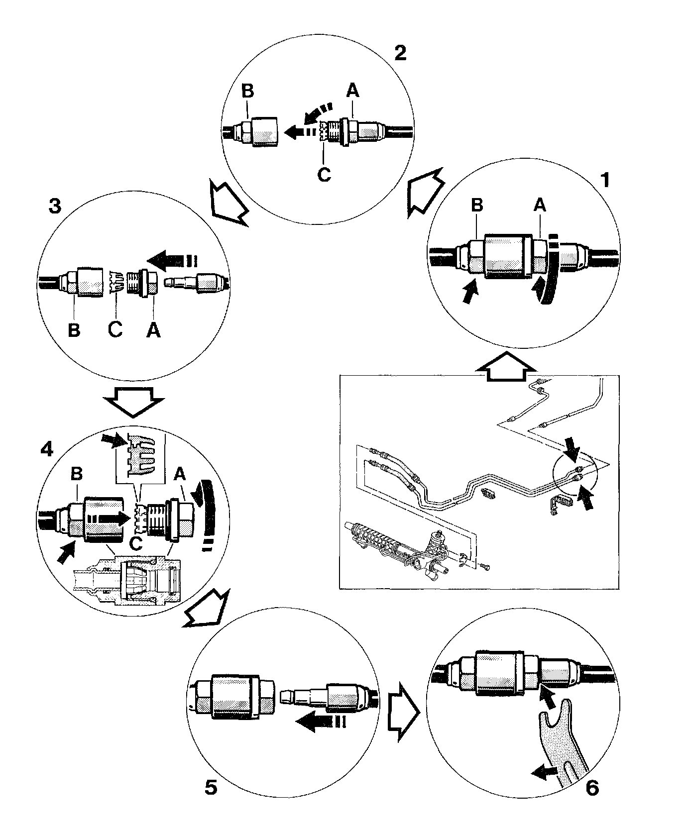 Perform preparations carefully when handling plug-in couplings - e.g. cleaning and fitting the plugs - as repairs are possible only by replacing the affected line in most cases. Only the threaded part A (with fitted O-rings) and the holder C are available as individual parts for the plug-in coupling. See illustration.