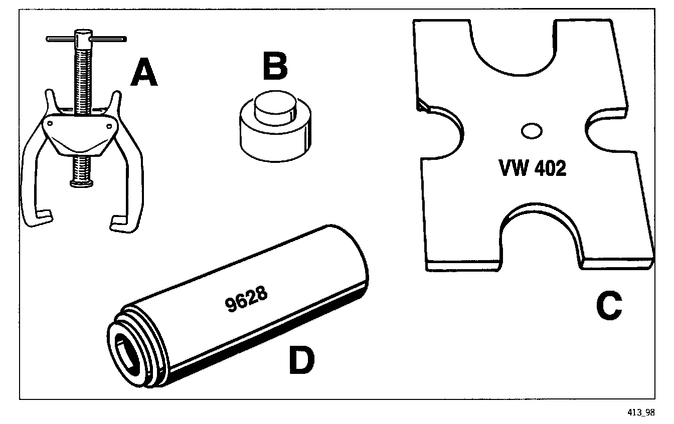 3. Use the pressure piece (special tool 9628) to press the rotor onto its seat. Use pressure plate VW 402 as the camshaft support surface on the workshop press.