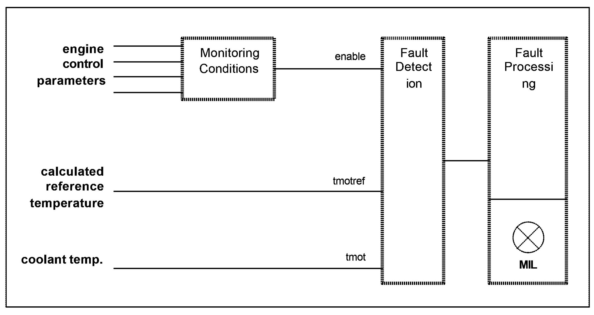 Due to a missing or stuck open thermostat the cooling temperature rise is delayed, especially at low ambient temperatures. The picture below shows an overview of the monitor. The thermostat monitor is designed to detect a delay in the warming up of the engine coolant temperature. Therefor the calculated reference temperature (based on coolant temperature at maximum heat radiation with functioning thermostat) is reused. At enabled monitoring conditions the difference between the calculated reference temperature and the coolant temperature is checked. If the difference is above a calibrated threshold for a calibrated period of time and the calculated reference temperature has not yet reached its maximum value, the fault is detected and its fault code is set. If the difference remains below the calibrated threshold for a time period longer than the above mentioned time an error from a previous warm up cycle may be cleared as soon as the calculated reference temperature has reached its maximum value.
