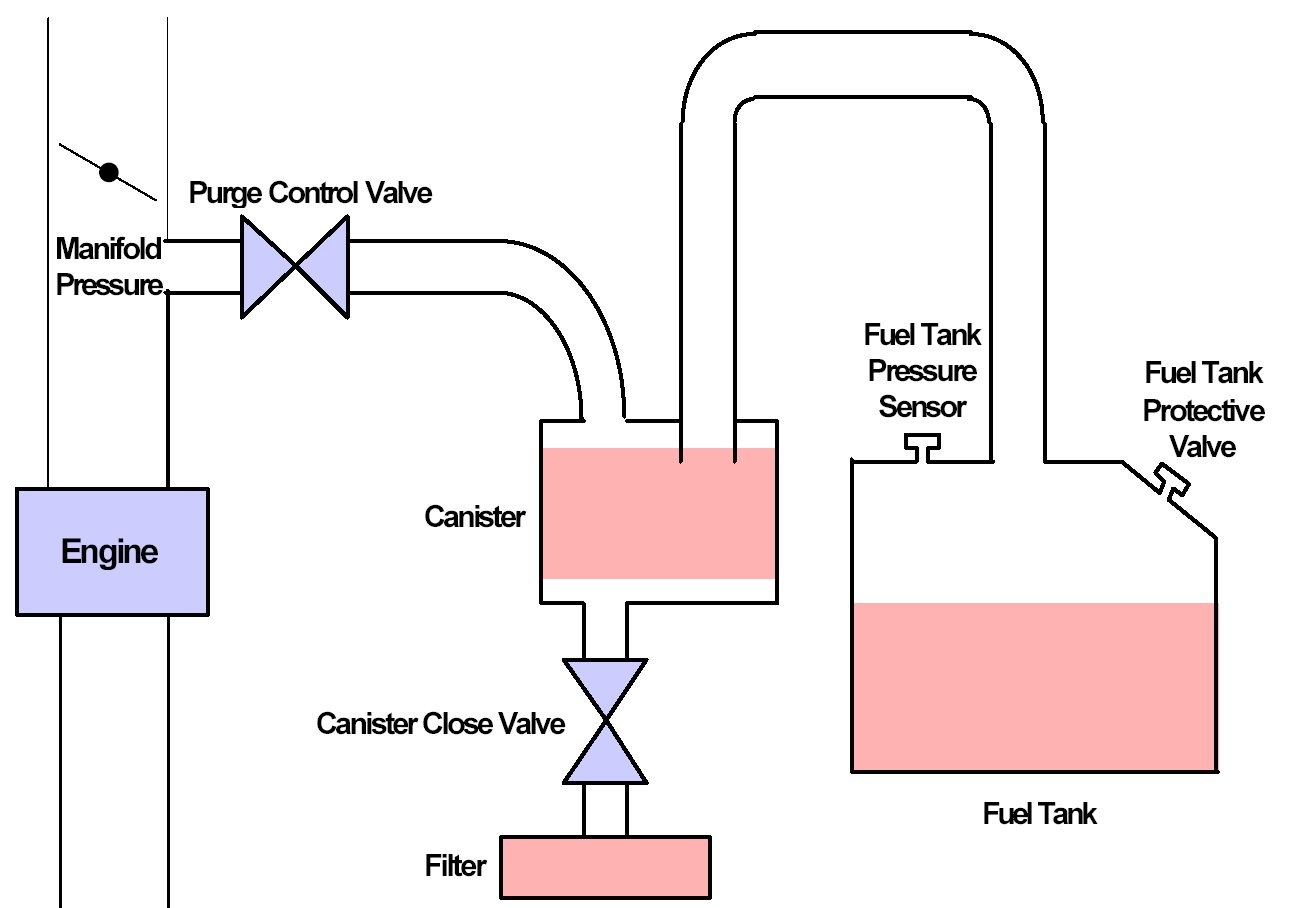 The system monitoring is performed by observing the fuel tank. A canister close valve (AAV) and a purge control valve (TEV) are used to open and close the system.