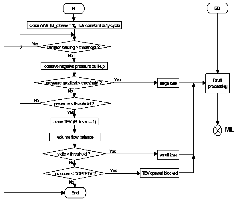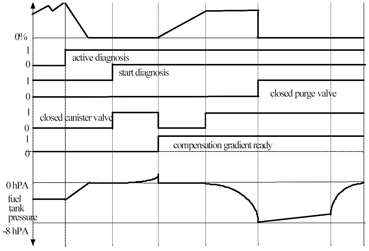 If a large lean correction of the lambda controller is detected, monitoring is stopped. If monitoring were to be continued, idle instability will occur because of the high canister load. If the negative pressure build-up gradient is below a certain threshold, a large leak is detected and the diagnosis is complete. If the pressure reaches a certain threshold (ex. -8 hPa), the TEV is closed. If the pressure reaches a specific threshold (ex. -15hPa), a TEV malfunction is detected (TEV stuck open) and monitoring is stopped.