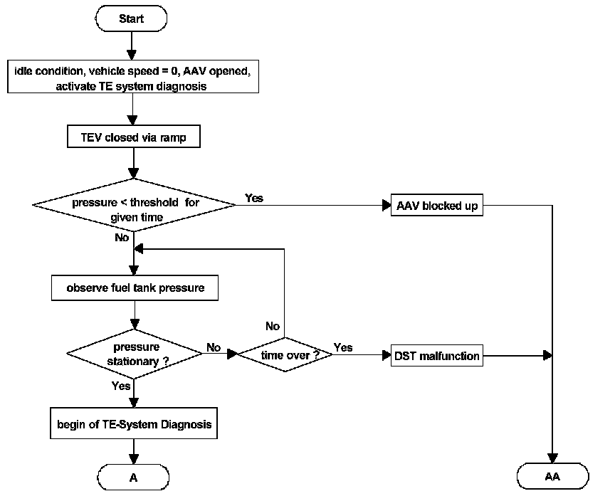 If the pressure is steady and the AAV closed, the pressure increase caused by fuel evaporation is measured and stored after a certain period. If the pressure reaches a specific threshold, monitoring is stopped, because the fuel evaporation is excessive. If the pressure reaches a specific threshold (vacuum), a TEV malfunction is detected (TEV stuck open) and monitoring is stopped.