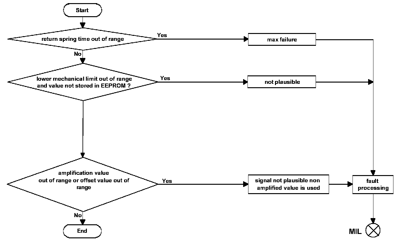 If the DLR output exceeds the upper or lower limit for a time longer than a given time an implausible duty cycle response / implausible actuator current fault is detected. The system is set to throttle valve drive default function state. If DLR output surpasses the limits only for a shorter time the system requests safety fuel deactivation for a short period. This fault is reversible.