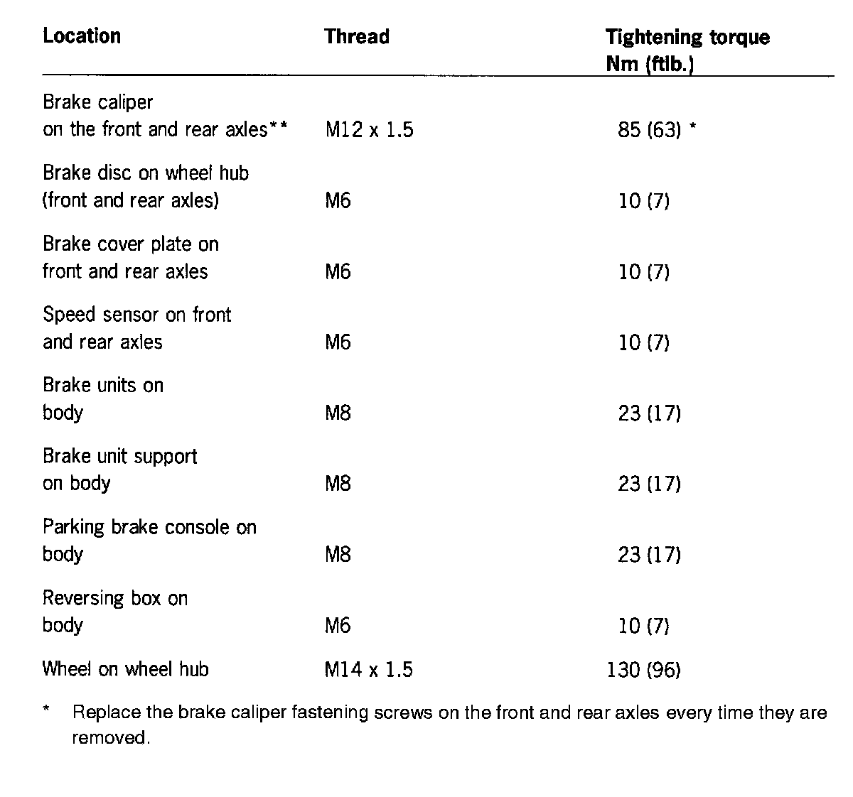 Tightening Torques For Mechanical Brake System