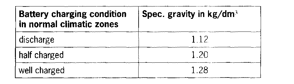The measuring values for the specific gravity of electrolyte of the individual battery cells should not deviate by more than 0.03 kg/dm3 from each other.