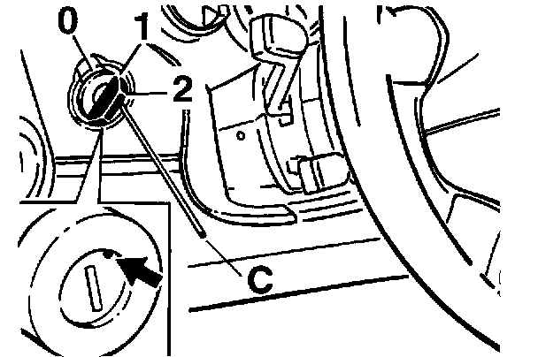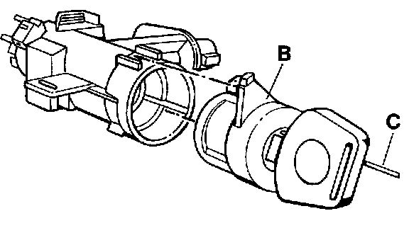 2. Press on the pawl of the lock barrel (locking pawl). With the pawl depressed, insert the ignition key and turn the key as far as it will go to position I (ignition on). In this position, insert the steel wire (C) that was used for removal.