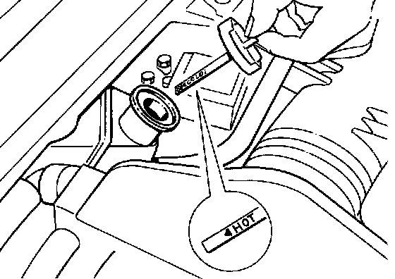 The reservoir is located in the engine compartment. There are two marks on the dipstick located on the reservoir cap. One side bears the mark "Cold" for a cold engine (approximately 20° C) and the other "Hot" for a hot engine (approximately 80° C).