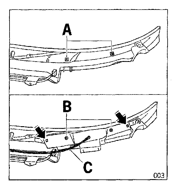 2.2 Clip in the telephone antenna in cowl panel cover (arrows) and fasten with screws (B).
