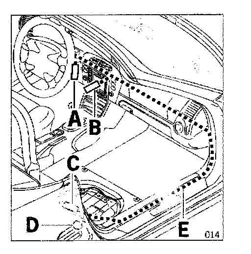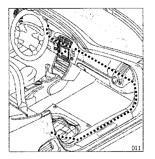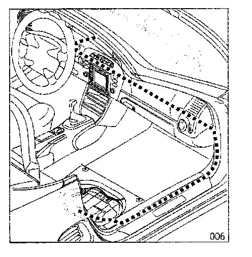 3.4 Route and secure antenna lead from the service grommet in the firewall, along the dashboard over the right A-pillar, and through the wiring duct to the right seat baseframe.