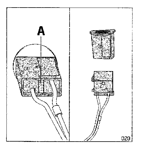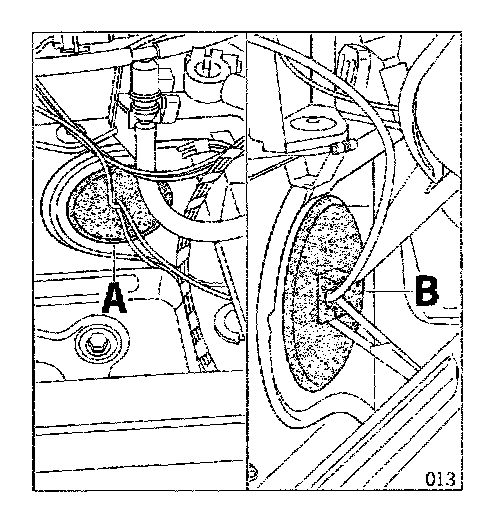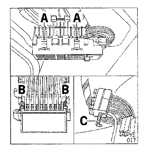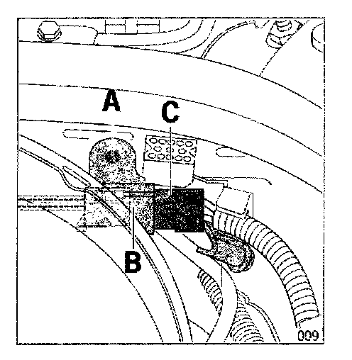 4.4.3 Press-out plastic pin (A) and remove holder (B) with socket (C) from radiator tank.