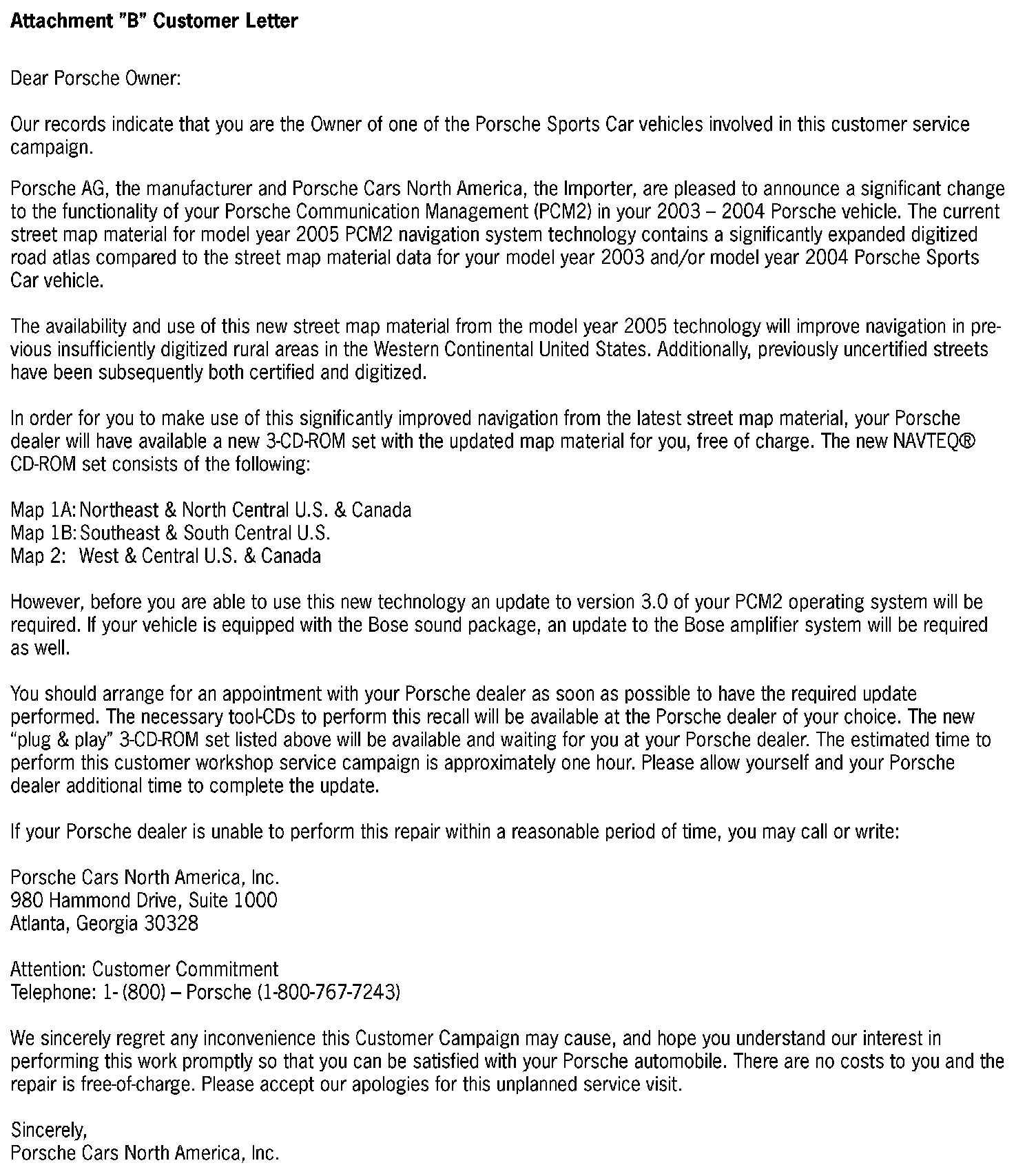 Porsche Cars North America, Inc., will notify All Owners of affected vehicles by First Class Mail during the week of April 15, 2004. See enclosed copy of the Customer Notification letter to the Porsche Owner (Attachment "B").