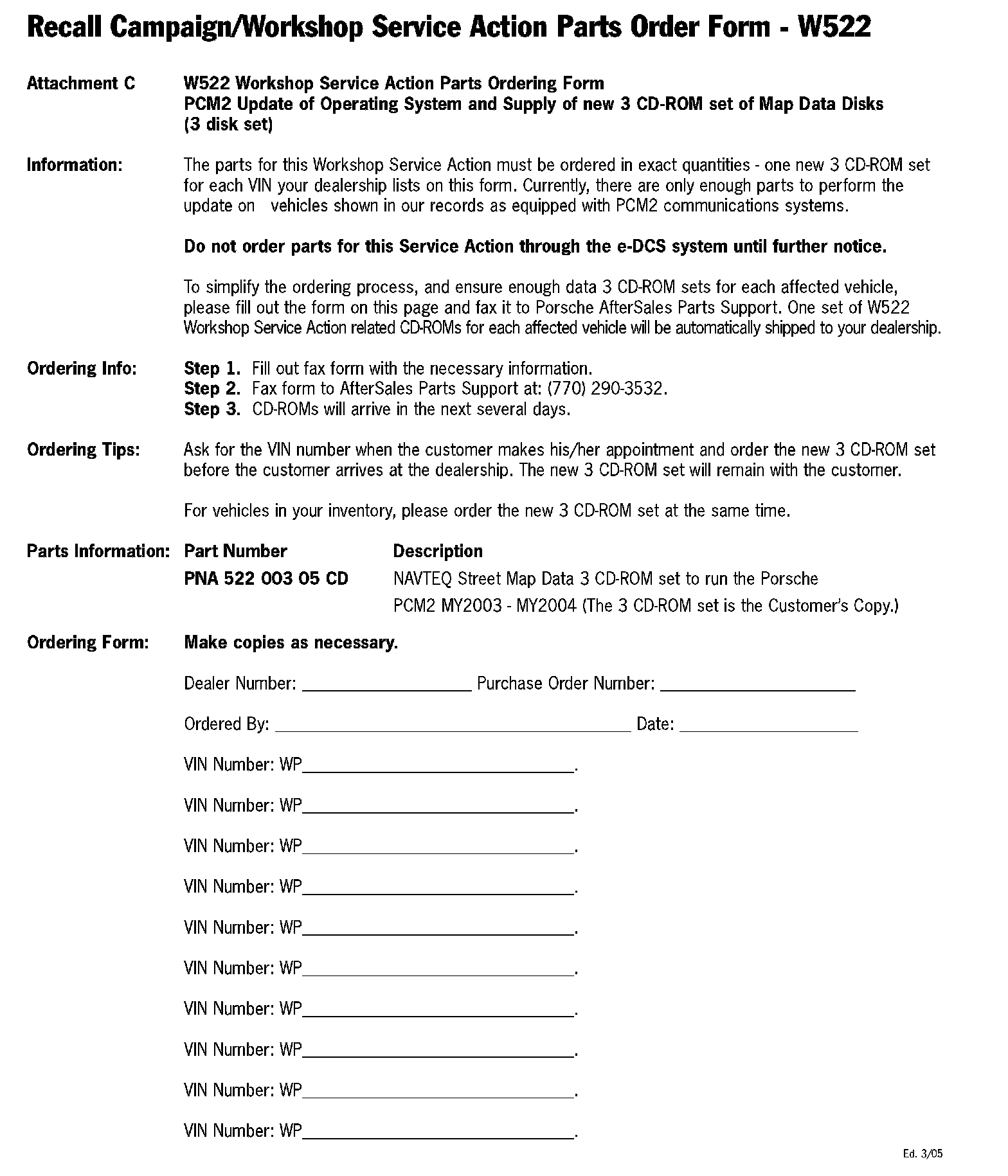 Recall Campaign/Workshop Service Action Parts Order Form - W522