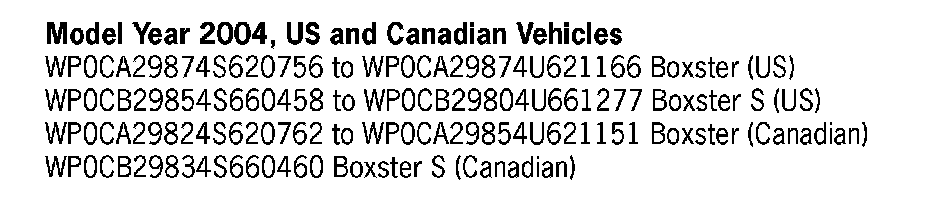 This is to inform you of a voluntary Workshop Service Action on certain 2004 model year Boxster (986) and Boxster S (986) vehicles. Wiring Harnesses with a faulty flat receptacle were installed in the relay socket of the "terminal XE" relay on the Porsche Boxster and Boxster S for model Year 2004. This can lead to a loose contact which can cause malfunctions in fog lights, seat heating and cigarette lighters.