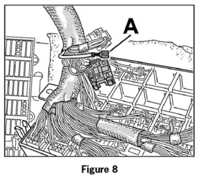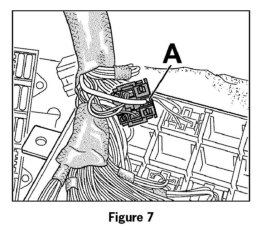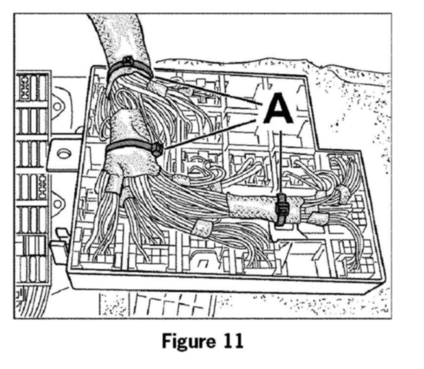7. Turn relay carrier as shown in Figure 5, set aside, and cut through the 3 tie-wraps of the wiring harness (Figure 5, Item A) with side cutters and remove.