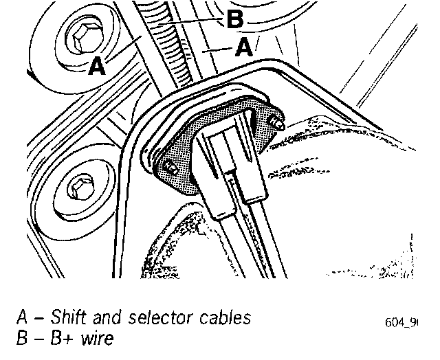 Note Always make sure that the B+ wire is routed between the shift and selector cables (A).