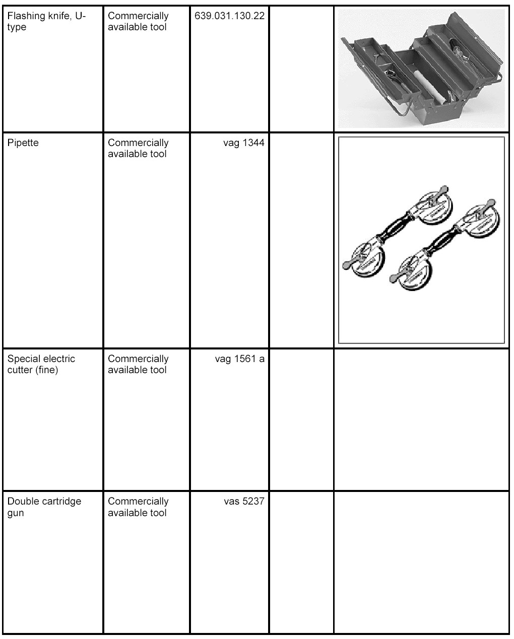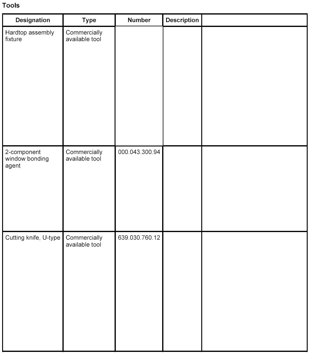 The following tools and materials are required for removal and installation of the rear window with 2-component adhesive: