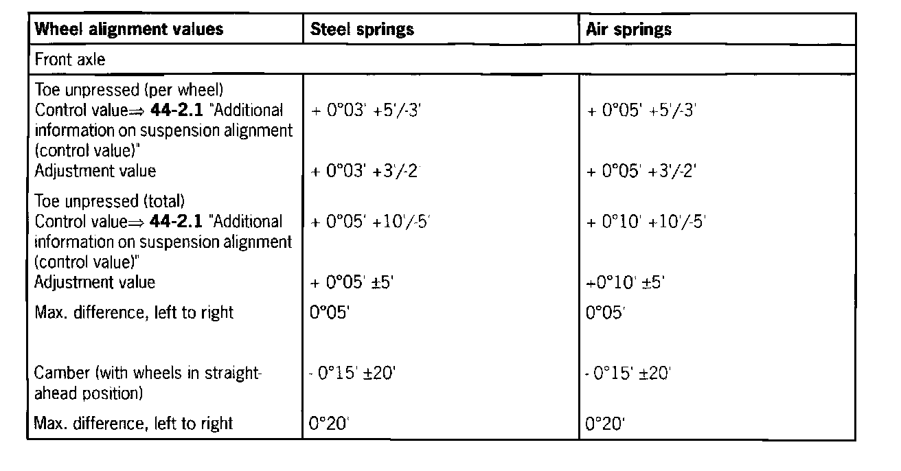 ^ The "control value" for the front axle is listed along with the adjustment values --> 44-1 "Adjustment values for suspension alignment".