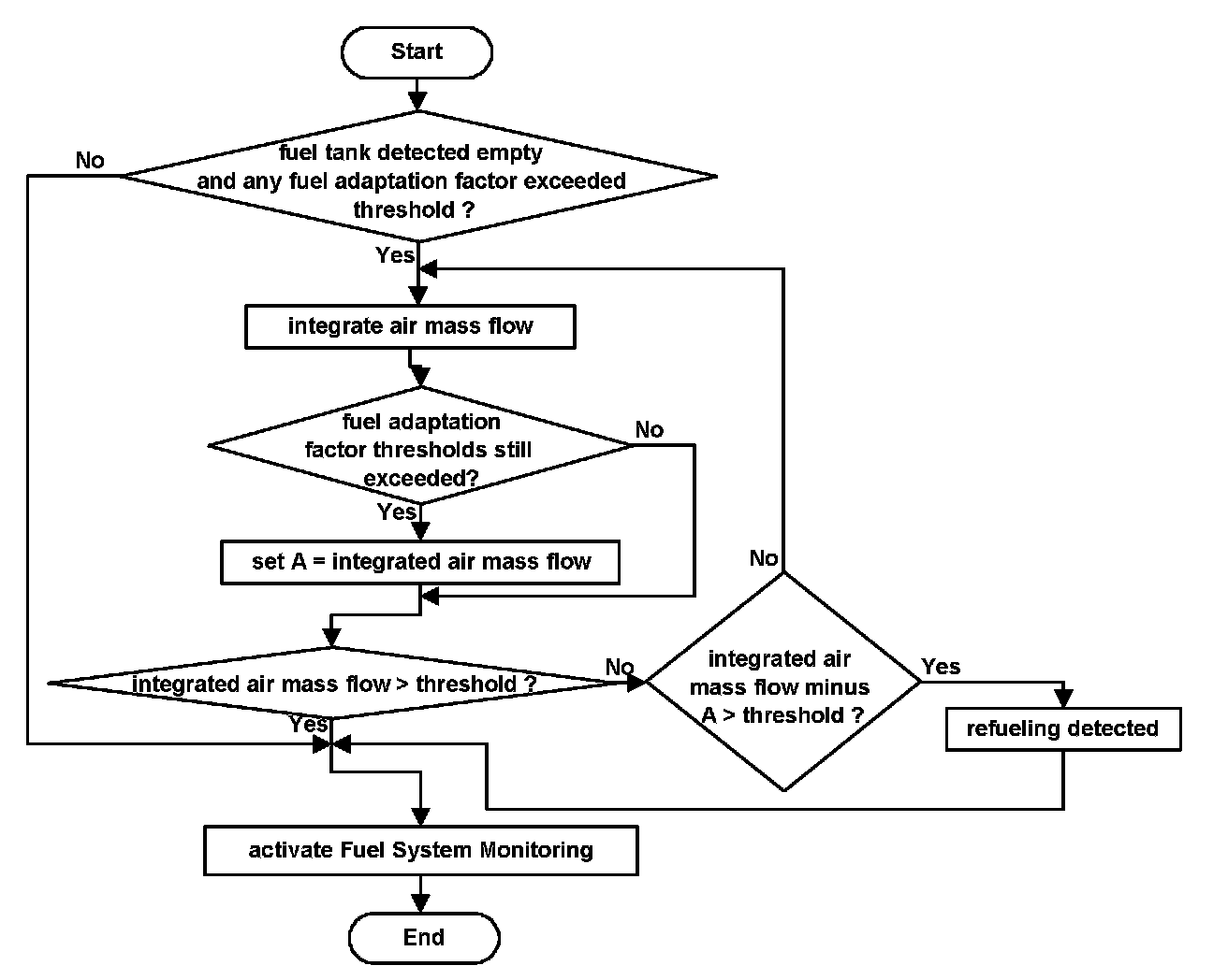 The flow chart illustrates the Fuel System Monitoring Function. The three-adaption integrators are evaluated. If they surpass a threshold, after having been activated for a certain period, the MIL is illuminated.