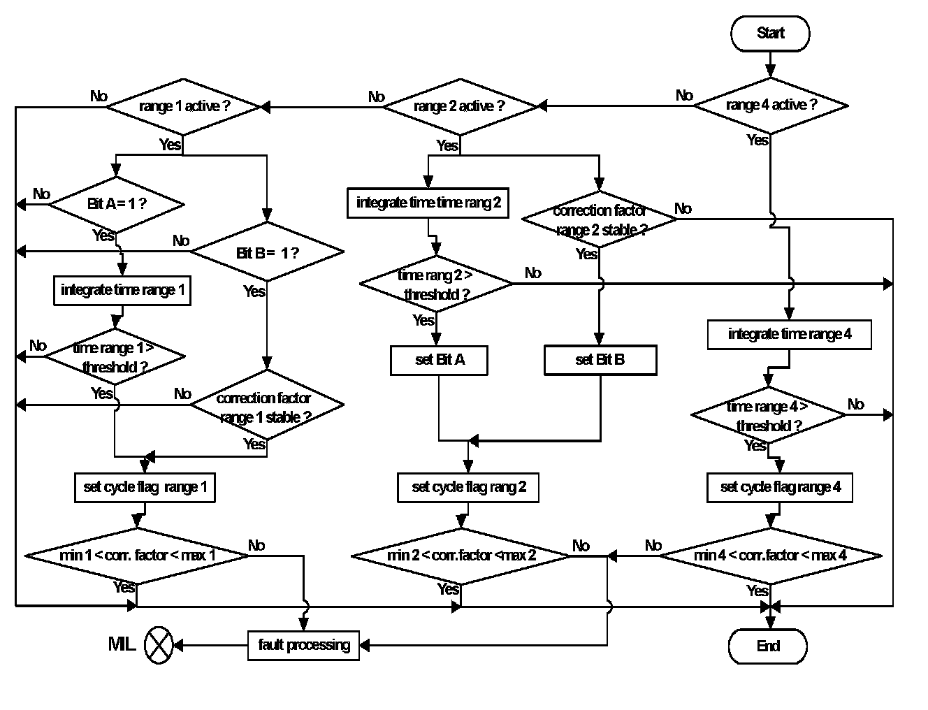 If range 1 is activated and the cycle flag of range 2 has been previously set, the adaption factor is checked for stability. If the adaption factor is stable the cycle flag is set. If the cycle flag from range 2 is not set but the flag for minimum time is set, the cycle flag can also be set, if the adaption range 1 has been activated for a certain period. It is now dependent on the values of the Adaption-Integrator, whether or not the MIL is illuminated.
