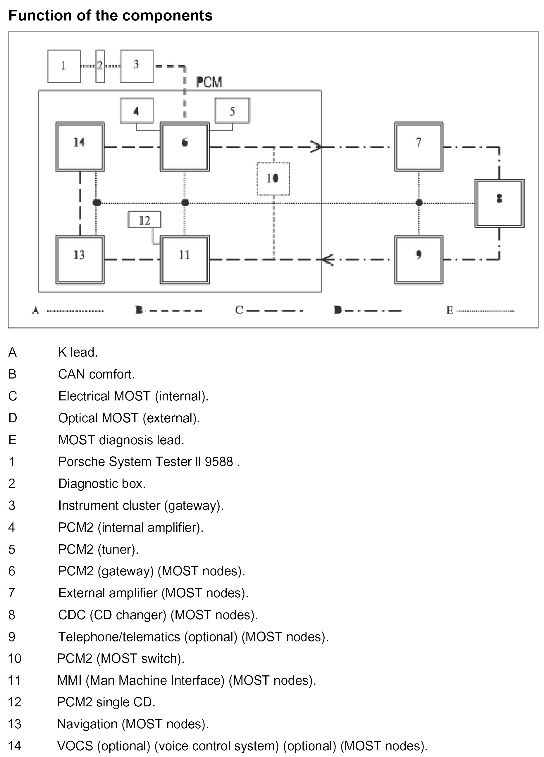 NOTE: When there is a customer complaint or identifiable problems but no fault code entries, firstly the MOST component check is to be selected in the PCM2 function selection menu and then the MOST system check is to be carried out.