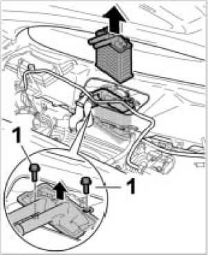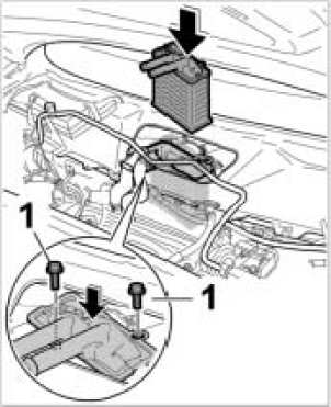 1. Carefully insert heat exchanger from above into the heating/air-conditioning unit and secure with the fastening screws -1-. Tightening torque 1.0 ftlb.