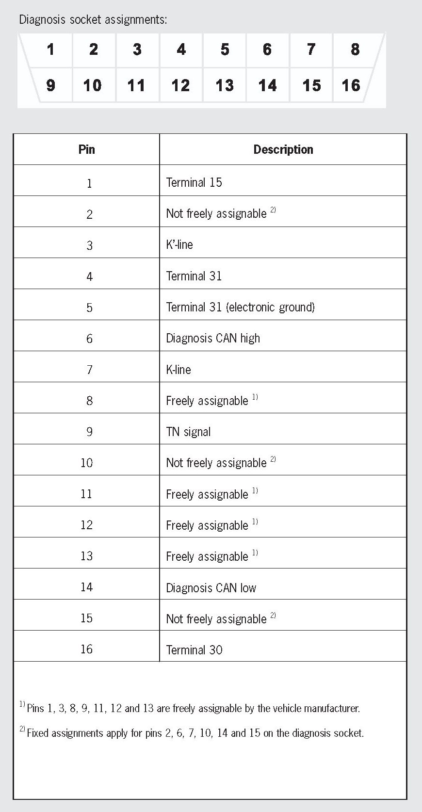 NOTE: The geometry and pin assignments of the diagnosis socket correspond to standards SAE J 1962 and ISO 15031-3.
